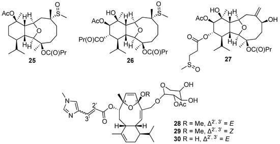 Sulfur-containing diterpenes (25–27) and diterpene glycosides (28–30) were identified from the cultured soft corals.
