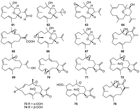 Cembranoids (61–76) isolated from the aquaculture soft corals of Lobophytum and Sarcophyton genera.
