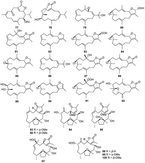 Cembranoids (77–100) isolated from the aquaculture soft corals of Sarcophyton and Briareum genera.