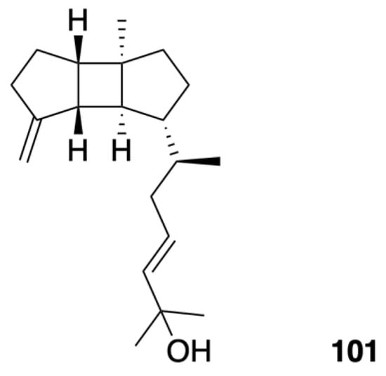 Leptoclalin A (101) (Figure 7) was isolated as a colorless oil from cultured soft coral Sinularia leptoclados. Its molecular formula was determined as C20H32O based on its HRESIMS spectrum. The detailed analysis of its spectroscopic data, in particular 2D NMR, resulted in the establishment of a new rare spatane diterpenoid [43].