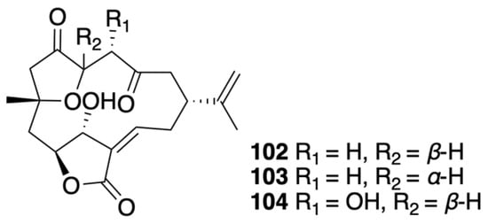 Norcembranoids are diterpene derivatives that lack a C-18 carbon substituent in comparison with C20-cembranoids [44]. Several norcembranoidal diterpenes were discovered from the culture of soft corals (Figure 8). For instance, an investigation of the chemical constituents of Sinularia leptoclados led to the isolation of two known norcembranoid diterpenes, 5-epi-sinuleptolide (102) and sinuleptolide (103) [43]. 5-epi-Sinuleptolide, along with a new analogue, 4α-hydroxy-5-epi-sinuleptolide (104), was also purified and identified from cultured soft coral Sinularia numerosa [45].