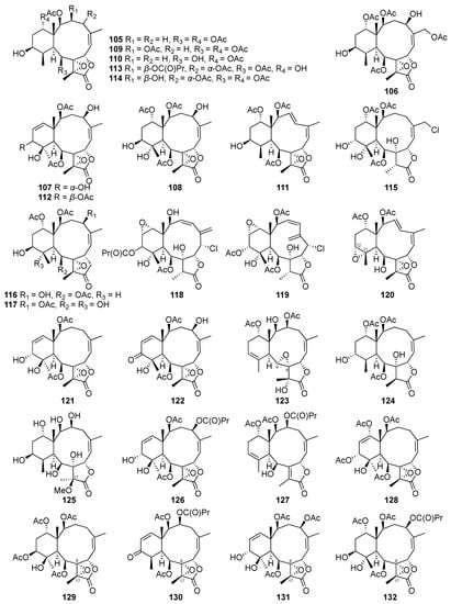 Briarane-type diterpenes (Figure 9, Figure 10 and Figure 11) are derived from the 3,8-cyclization of cembranoid [46]. This type of diterpenoid skeleton is only found in marine organisms, particularly in octocorals [47]. The chemical investigation of the cultured scleraxonia Briareum stechei led to the discovery of four new diterpenoids-briaexcavatins I–L (105–108). Other two known compounds, excavatolides C (109) and E (110), were first found in the wild-type Briareum stechei discovered in Taiwan and were also isolated from the culture-type coral. The absolute configurations of 109 and 110 were further confirmed by X-ray data analysis for the first time [48].