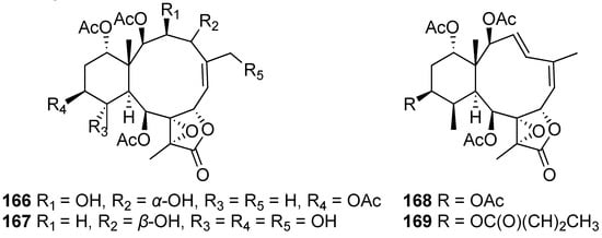In a recent study on the chemical constituents of the cultured soft coral Briareum violaceum, three new polyacetoxybriarane diterpenoids, briavioids A-C (166–168), as well as two known analogues, briaexcavatin M (111) and excavatolide F (169), were isolated. The structure of briavioid A (166) was fully confirmed by single-crystal X-ray diffraction analysis [65] (Figure 11).