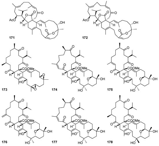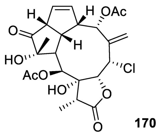 Aquariane-type diterpenes possess a tricyclic system that includes a nine-membered ring fused to two five-membered rings [66]. The aquariane scaffold is assumed to be a biosynthetic product of a precursor possessing briarane skeleton by the sequent di-π-methane and vinyl-cyclopropane rearrangements. Aquariolide A (170), a new compound isolated from the cultured Erythropodium caribaeorum, was an example of an aquariane skeleton [28] (Figure 12).