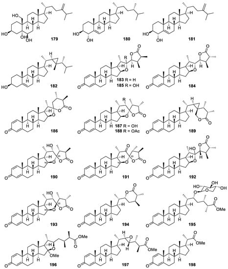 A chemical investigation demonstrated that the cultured-type soft coral Sinularia brassica is an abundant supply of bioactive steroids as compared with the wild type of the same species. A series of sixteen new withanolidal and non-withanolidal steroids, including sinubrasolides A–G (183–189) [68], sinubrasolides H–L (190–194) [69], and sinubrasones A–D (195–198) [70], were purified and identified from the soft coral Sinularia brassica cultivated in a tank for five years. The authors also mentioned that sinubrasolides H, I, and K (190, 191, and 193) shared a common 16,23-oxa-bridged tetrahydropyran framework, which was considered as a novel structure of withanolidal steroid [69].