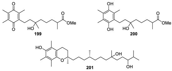 Flexibilisquinone (199), sarcotenuhydroquinone (200), and crassumtocopherol C (201).