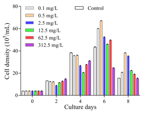 In this study, we quantified the growth of P. tricornutum under different treatments by both measuring the absorbance at 680 nm and counting cell numbers under a microscope. There was a good correlation between these two approaches in the first 8 days of the culture without AA supplement. Our statistical analysis resulted in a linear equation of y = 0.0095x − 0.0005 (y represents the value of the OD680, x represents the number of cells) with a correlation coefficient R2 = 0.9962. After 4 days, the growth slowed down and a maximal cell concentration was reached at the 6th day. Treatment with different concentrations of AA showed different effects on the growth of P. tricornutum (Figure 1). Low concentrations of AA (0.1 to 62.5 mg/mL) helped maintaining the growth in the first 4 days, and further increased to the 6th day. However, the growth of P. tricornutum was significantly repressed by high concentration of AA (e.g., 312.5 mg/L), and started to decline after the 4th day (Figure 1).