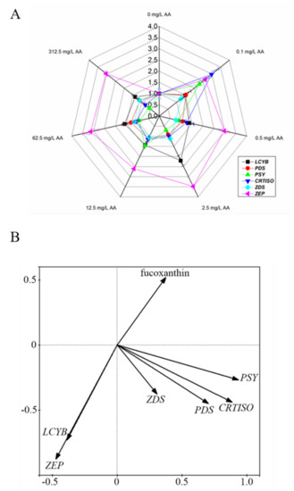 As the accumulation of fucoxanthin was induced by AA treatment, we quantified the expression of the genes identified in carotenoid metabolism pathway. Treatment with 0.1 mg/L AA promoted the expression of all these genes (LCYB, PSY, PDS, CRTISO, ZDS and ZEP) (Figure 2A). In all AA-treated samples, ZEP was expressed at higher levels compared with the control, suggesting that the algal cells encountered a stressed condition induced by the exogenous AA. PCA indicated major contribution of PSY, PDS and CRTISO genes to fucoxanthin production, compared with that of LCYB, ZDS and ZEP (Figure 2B). In addition, the contribution of PSY is the highest among these genes (Figure 2B).