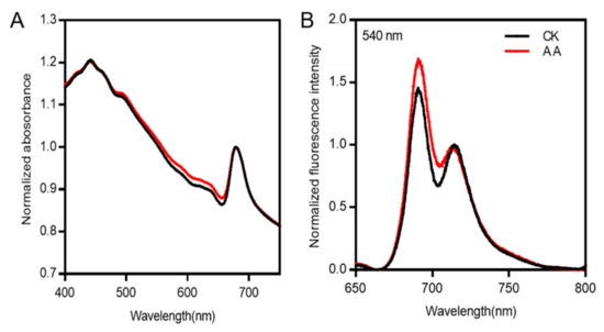 Absorption spectrum in the regions of 400–750 nm (A) and 77 K fluorescence emission spectra excited at 540 nm (B). (A) The black line and the red line represent the spectra of algae with and without arachidonic acid (AA) treatment (0.1 mg/L), respectively, normalized by the peak intensity of Chl a. (B) The black line and the red line represent the spectra of control check (CK) and AA treatment (0.1 mg/L), respectively. The spectra of CK and AA were normalized at 713 nm.