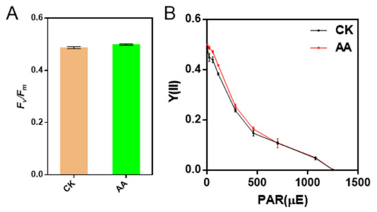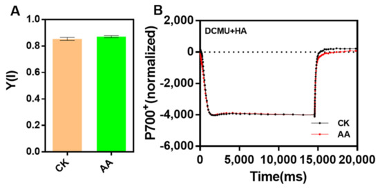 In order to investigate whether the activities of PSII and PSI were affected when the algae were treated with AA, Chl fluorescence and P700 redox kinetics were employed to detect. The value of Fv/Fm of the algae under the treatment of AA was similar to that of CK, while Y(II) was a little higher in AA-treated algae than that of CK when the light intensity of AL was lower than 300 μmol photons m−2 s−1 (Figure 4), suggesting that the electron transport through PSII was enhanced under the treatment of AA.
