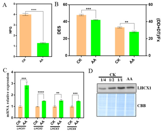 In order to investigate whether non-photochemical quenching was changed in AA-treated P. tricornutum, which absorbed more excessive energy, a DUAL PAM-100 Chl fluorometer was employed to confirm variation in NPQ. The results showed that NPQ of AA-treated P. tricornutum was decreased significantly compared with that of CK (Figure 6A). NPQ in diatom is mainly linked to diadinoxanthin-diatoxanthin cycle, which is similar to xanthophyll cycle in higher plants and green algae [18,32,33,34]. The effect of DT as an antioxidant against the damage of reactive oxygen species under long-term high light is also proposed [2]. In order to understand the origin of the decreased NPQ, de-epoxidation states (DES), the ratio between DT and DT+DD, and the relative level of xanthophyll (DD+DT), which was normalized to the fucoxanthin content, were detected (Figure 6B). The value of DES and the relative level of xanthophyll (DD+DT) in AA-treated P. tricornutum were lower than that in CK (Figure 6B), which was in accordance with the decreased NPQ.