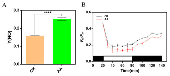 To investigate whether AA treatment leads to photoinhibition, Y(NO), the quantum yield of non-regulated non-photochemical energy dissipation, was measured, and the result showed that the value of Y(NO) in AA-treated algae was higher than that in CK (Figure 7A), which indicated that AA-treated algal cells might suffer from photoinhibition. In the meantime, changes of PSII activity (Fv/Fm) during high light treatment (1000 μmol photons m−2 s−1) and subsequent dark recovery were also measured to monitor the photoinhibition process and the ability of the cells to recover from photoinhibition. The value of Fv/Fm declined in both AA-treated cells and the CK ones during high light exposure, and recovered during the following darkness adaptation (Figure 7B). PSII activity in AA-treated cells decreased faster and to a lower level when exposed to high light compared with the CK ones, and was still lower than the CK ones even after 1 h recovery in the dark (Figure 7B). In a word, the AA-treated algae are prone to suffer from photoinhibition.