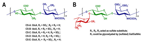 Neurons are highly differentiated terminal cells that cannot regenerate. If compounds can promote neuronal growth, it will be meaningful for treatment of neuronal damage and degeneration. Chondroitin sulfate (CS) is a class of glycosaminoglycans and is involved in cell division and neuronal development. CS proteoglycans (CS-PGs) were defined as inhibitory molecules of neuron growth in early experiments, and the use of chondroitinase ABC could attenuate the inhibitory effect on neuron growth [1,2,3]. However, some researches have reported that CS could promote neuronal growth [4]. According to the sulfation sites on the saccharide chain, CS could be classified as type A, B, C, D, E, et al. (Figure 1A). CS-A, CS-B, and CS-C were considered to inhibit neuron growth, while CS-D and CS-E exhibited neurite outgrowth-promoting activity. Some reports also proved that CS-E strongly inhibited nerve regeneration [5,6,7,8,9,10]. It has been known that commercially available CS retains heterogeneity, including CS-A (50–80% of A-type unit), CS-C (50–70% of C-type unit), CS-D (20–40% of D-type unit) and CS-E (63.6% of E-type unit). The low purity of saccharides may contribute to the contradictory results [11].