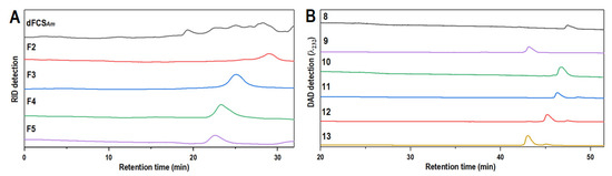 HPGPC profiles of dFCSAm, F2–F5 (Superdex peptide 10/300 GL column) (A); HPLC profiles of oligosaccharides 8–13 (Dionex IonPac™ AS11-HC column) (B).