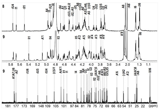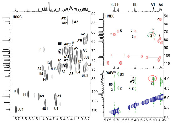 The structures of oligosaccharides 8–13 were elucidated by the aid of their 1D & 2D NMR spectra (Figure 3, Figure 4, Figure 5 and Figure 6, and Figures S2 and S3) and ESI-Q-TOF MS spectra (Figure S5).