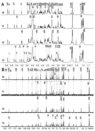 1D (1H, (A); 13C, (B)) NMR spectra and chemical shifts assignments of 10–13.