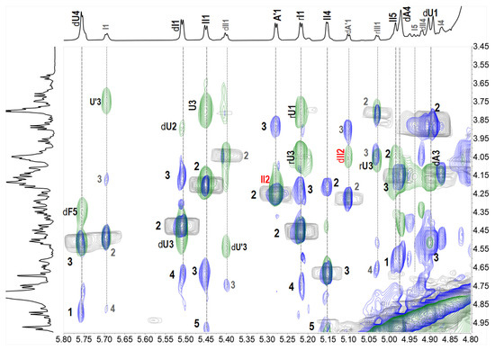 Partial superimposed spectra of 1H-1H COSY/TOCSY/ROESY of 13 (COSY-gray, TOCSY-blue, ROESY-green).