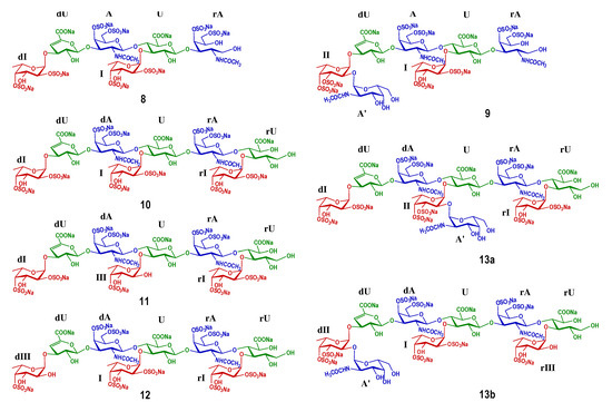 For 13, two sets of signals different in the integration area reflected in its 1H NMR spectrum, suggesting that 13 was a mixture. In terms of the prevailing component, compared with 10, three more signals were observed at the region of 5.0–5.7 ppm besides the H-1 of Fuc2S4S at the non-reducing and reducing ends (5.51 and 5.22 ppm). According to the superimposed spectra of 1H-1H COSY/TOCSY/ROESY of 13 (Figure 6), the protons at 5.15 and 5.45 ppm came from the same spin coupling system. Detailed analysis on the COSY and TOCSY spectra showed that it was an Fuc residue with sulfation at O-3 and O-4 (Fuc3S4S, designated as II). The H-5 of II (4.98 ppm) indicated that it is in the middle of the saccharide chain. The proton at 5.28 ppm, combining with the extra carbon signal at 100.5 ppm, and the extra methyl signal at ~2.0 ppm, outlined the presence of a GalNAc residue (A’). A’ connected to II by an α1,2 linkage, revealing from the correlation peak of A’1 (5.28 ppm) and II2 (4.15 ppm) in the ROESY spectrum. Thus, the main component in 13 (designated as 13a) was deduced as a nonasaccharide with the structure of L-Fuc2S4S-(α1,3)-L-Δ4,5GlcA-(α1,3)-D-GalNAc4S6S-(β1,4)-[D-GalNAc-(α1,2)-L-Fuc3S4S-(α1,3)-]-D-GlcA-(β1,3)-D-GalNAc4S6S-(β1,4)-[L-Fuc2S4S-(α1,3)-]-D-GlcA-ol. For the minor component, it was also elucidated as a nonasaccharide with the structure of D-GalNAc-(α1,2)-L-Fuc3S4S-(α1,3)-L-Δ4,5GlcA-(α1,3)-D-GalNAc4S6S-(β1,4)-[L-Fuc2S4S-(α1,3)-]-D-GlcA-(β1,3)-D-GalNAc4S6S-(β1,4)-[L-Fuc4S-(α1,3)-]-D-GlcA-ol (13b). The structures of oligosaccharides 10–13 were presented in Figure 7.