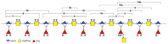 In our last work, from the size-homogeneous fractions with low degree of polymerization that separated from the β-eliminative depolymerized product dFCSAm, we have elucidated a series of purified oligosaccharides, including tri-, tetra-, penta-, and hexasaccharides [23]. The branches contained the mono- and disaccharide [Fuc4S, Fuc2S4S, and GalNAc-(α1,2)-Fuc3S4S]. Here, we have purified and elucidated the oligomers 8–13 consisting of hexa-, hepta-, octa-, and nonasaccharide from the fraction F3 with a higher degree of polymerization. 8–13 presented a continuation with the structural features summarized before which are composed of the central core of 3)-D-GalNAc4S6S-(β1,4)-D-GlcA-(β1, and the sulfated branches [Fuc4S, Fuc2S4S, and GalNAc-(α1,2)-Fuc3S4S]. Oligosaccharides that contain the heterodisaccharide branch were confirmed again. These results further supported our structural deduction of the natural FCSAm: its backbone consists of a repeating disaccharide unit of GlcA and GalNAc linked alternatively by β1,4 and β1,3, wherein all the GalNAc residues were sulfated at O-4 and O-6, the same as CS-E; all the GlcA residues were branched and all the branches glycosylated at O-3 of GlcA, instead of any other sites; the branch types included sulfated fucose (Fuc4S and Fuc2S4S) and heterodisaccharide [GalNAc-(α1,2)-Fuc3S4S]; the disaccharide branches distributed randomly, but there was no case that such disaccharide branches adjacently distributed in the saccharide chain. All of the reducing end residues (Fuc) of the heterodisaccharide branch were sulfated both at O-3 and O-4, while no sulfation occurred on any sites of the non-reducing end residues (GalNAc) (Figure 8). The sulfation pattern of the heterodisaccharide branch seemed conserved, markedly differing from that reported in the FCS from the sea cucumbers Holothuria nobilis and Ludwigothurea grisea [17,19].