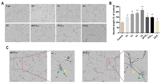 Effects of FCSAm, dFCSAm, and the size-homogeneous fractions F2–F5 on neurite outgrowth (n = 4–6) (A,B). Cells were cultured for 2 days in plates coated with PDL (50 μg/mL) alone (control) or size-homogeneous fractions F2–F5 (50 μg/mL). The length (n = 50–100 cells) of the longest neurite (mean ± SD) was measured by Image J software and expressed as percentage of growth relative to control (* p < 0.05, ** p < 0.01); the aggregation phenomenon of FCSAm, and dFCSAm, and neurite and cell body aggregation are indicated by yellow and green arrows, respectively (C). Scale bar, 200 μm.