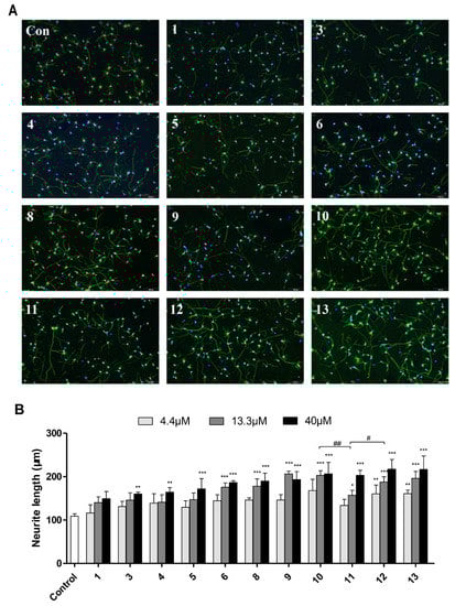 Only cells with neurites longer than one cell body diameter were counted. The length of the longest neurite (50–100 cells) were measured by Image J software and expressed as percentage of growth or length, relative to control (* p < 0.05, ** p < 0.01, or *** p < 0.001). The percentage of growth rate was calculated as follows: growth rate (%) = (length of tested group–length of control group)/control group × 100%. All data were expressed as mean ± SD. A statistical analysis was performed using IBM SPSS Statistics 20. Statistical significances were evaluated with a two-sided unpaired Student’s t-test for two-group comparisons, and a one-way ANOVA followed by the Dunnett post hoc test for multigroup comparisons. p < 0.05 was considered statistically significant [12,28].