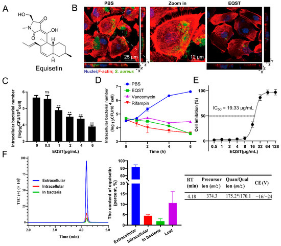 Equisetin (EQST) kills intracellular S. aureus by targeting host cells. (A) The chemical structure of equisetin. (B) The representative images of intracellular S. aureus ATCC 29213 in IEC-6 cells treated with PBS or 4 μg/mL equisetin (MOI = 1, infected 4 h). Extracellular S. aureus was removed by the treatment with gentamicin at 100 μg/mL for 30 min. (C) The number of intracellular S. aureus in IEC-6 cells treated with equisetin (0–6 μg/mL) (MOI = 1, infected 4 h). (D) The number of intracellular S. aureus in IEC-6 cells treated with 4 μg/mL equisetin at different time pionts. (E) Cytotoxicity of IEC-6 cells in the absence or presence of equisetin for 24 h. Cytotoxicity is presented as cell inhibition percentage. ((F), left and middle) Distribution of extracellular antibiotics, intracellular antibiotics in the cytosol of IEC-6 cells, and antibiotics in S. aureus quantified by LC–MS/MS. The loss of antibiotics was calculated from the total antibiotics minus the other detectable antibiotics. ((F), right) Basic information of LC/MS method. RT, retention time. *: quantitative ion. Data are representative of three independent experiments and values are expressed in mean ± SD. ** p < 0.01, ns p > 0.05, p-values were determined by unpaired t-tests, using PRISM 8.0.
