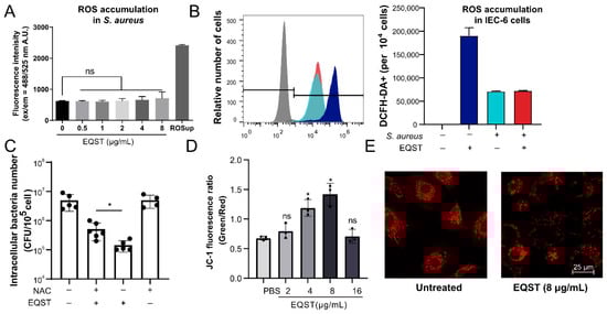 Equisetin increases cellular ROS accumulation through mitochondrial function mediation. (A) ROS content of S. aureus cells was stained by DCFH-DA before being exposed to equisetin. The fluorescence of DCFH-DA+ was detected by microplate reader. A.U. stands for absorbance unit. (B) ROS content of S. aureus-infected IEC-6 cells were stained with DCFH-DA before being co-incubation with equisetin. The fluorescence of DCFH-DA+ was detected by flow cytometer. S. aureus or EQST treatment was indicated as “+” or “ − ”. (C) The bacterial number of intracellular S. aureus in IEC-6 cells was analyzed by plate-counting assay. Representative data are indicated as circles. (D) The mitochondrial membrane potential of IEC-6 cells was labeled by JC-1 fluorescent probe. The fluorescence of JC-1 was analyzed by microplate reader. Representative data are indicated as circles. (E) Representative images of mitochondria in IEC-6 cells. Mitochondria were stained by MitoTracker-Red. Bar: 25 μm. Data are representative of three independent experiments in (A–D), and values are expressed in mean ± SD. * p < 0.05, p-values were determined by unpaired t-tests, using PRISM 8.0.
