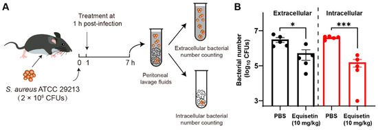 Equisetin reduces intracellular S. aureus in vivo. (A) Scheme of experimental protocol for the intracellular S. aureus infected mouse model. (B) The number of extracellular and intracellular S. aureus in peritoneal lavage fluids. Data are representative of five independent experiments and values are expressed in mean ± SEM. * p < 0.05, *** p < 0.001, p-values were determined by unpaired t-tests, using PRISM 8.0.