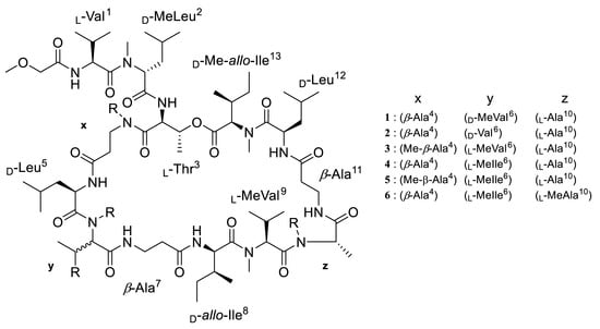 - Doi, M.; Ishida, T.; Kobayashi, M.; Deschamps, J.R.; Flippen-Anderson, J.L. The highly solvated structure of theonellapeptolide Id, a tridecapeptide lactone from the Okinawa marine sponge Theonella swinhoei. Acta Cryst. 1999, 55, 796–798. [Google Scholar] [CrossRef]