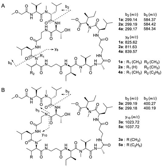 Tandem mass analyses of the seco-acid methyl ester peptide of 1, 2, and 4 (A); 3 and 5 (B) showed their three predominant fragment ions.