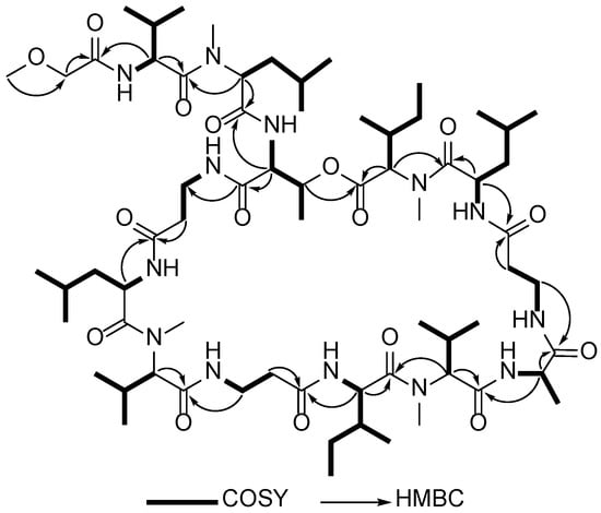 To overcome the difficulty posed by these broad and overlapped NMR signals, we performed tandem mass (MS2) and MS/MS/MS (MS3) analyses of fragment ions of seco-acid methyl esters (1a–5a) (Figure 2). The seco-acid methyl esters (1a–5a) were generated by the treatment of the cyclic depsipeptides (1–5) with 7 M ammonia in methanol solution to facilitate ring-opening methyl esterification of the macrolactones. Fragment ions generated from these peptides can be referred to as the b and y series for the N-terminal and the C-terminal fragments, respectively [27,28]. The fragmentation profiles of these linear peptides (1a–3a) were analyzed in comparison with the seco-acid methyl esters (4a and 5a) derived from known compounds (4 and 5). The amino acid sequence could be determined, except for amino acid residues with the same molecular weights, such as Ile and Leu. The amino acid residues unidentified by MS were assigned based on NMR data and thus the sequences of new compounds 1–3 were determined.