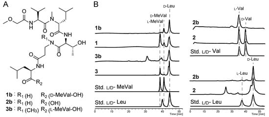 Upon determining the amino acid sequences of the isolated compounds, we deduced the configurations of the amino acid residues by means of Marfey’s analysis [29]. Compounds 1–3 consisted of several duplicated amino acids such as methyl valine (duplicated in 1 and 3), valine (duplicated in 2), and leucine (duplicated in 1–3) (Figure 1). Hence, to unambiguously determine the configuration of each residue, we performed partial hydrolysis of 1–3 to obtain a peptide fragment containing one of each duplicated residue (Figure 4A) followed by Marfey’s analysis. We then compared the results to those of the obtained from the totally hydrolyzed of intact compounds.
