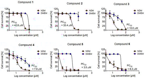Newly isolated compounds 1–3, along with known 4, 5 (theonellapeptolides type II series), and 6 (theonellapeptolides type I) were subjected to cytotoxic activity against pancreatic cancer cells in a nutrient-deprived media condition using anti-austerity strategy [30]. The anti-pancreatic cancer cytotoxic activity of all isolated theonellapeptolide-type compounds (1–6) were evaluated against the MIA PaCa-2 cell line. Data are presented as preferential cytotoxicity (PC50) values, which represent the concentration that kills 50% of cancer cells in a nutrient-deprived medium (NDM) without any toxicity in a nutrient-rich medium DMEM (Dulbecco’s Modified Eagle Medium). Among the tested compounds, theonellapeptolides 3, 4, 5 and 6 exhibited the most potent preferential cytotoxicity, with PC50 value of 10.0, 7.8, 3.5 and 8.2 μM, respectively (Figure 5). The isolated members of theonellapeptolide II series (1–5) exhibited preferential cytotoxic activity under NMD condition. Those compounds (1–5) share similar amino acid residue in their structure. The structure–anti-austerity activity relationship of 1–5 revealed that the combination of N-Me-β-Ala4 and N-MeIle6 gave more potent activity with a PC50 value below 4 μM as shown by 5 (3.5 μM). The presence of only one of these residues in their structure showed potent preferential cytotoxicity at the range of 7.8–10 μM as observed in 4 containing a N-MeIle6 (7.8 μM) and 3 containing N-Me-β-Ala4 (10.0 μM). However, the absence of these two residues displayed a moderate activity at the range of 33.4–42.8 μM. On the other hand, the presence of N-MeIle6 in theonellapeptolide Id (6) showed activity similar to compound 4 and 3 with PC50 value of 8.2 μM (Figure 5). These data suggested that the presence of N-Me-β-Ala4 and/or N-MeIle6 is important feature for the preferential cytotoxic activity of theonellapeptolide-type compounds. Therefore, theonellapeptolides 1–6 and their derivatives represent excellent anti-cancer candidates under nutrient starvation condition.