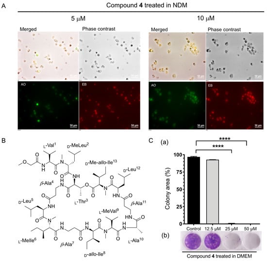 (A) Morphological changes of MIA PaCa-2 cells induced by 4 in a nutrient-deprived medium (NDM). MIA PaCa-2 tumor cells were treated with 4 at the indicated concentrations in NDM in a 24-well plate and incubated for 24 h. The cells were stained with ethidium bromide (EB) and acridine orange (AO), and photographed in the fluorescence (red and green) under phase contrast modes using a Nikon sCMOS camera oxford instrument, Hamamatsu Photonics/Ti-E. (B) Structure of bioactive compound 4. (C) Effect of 4 on colony formation by MIA PaCa-2 cells in DMEM. (a) Graph showing the average values of the area occupied by MIA PaCa-2 cell colonies (three replicates). **** p < 0.0001 compared to the untreated control group. (b) Representative wells showing colonies of MIA PaCa-2 cells.