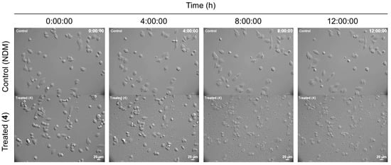 Captures of the live imaging of the effect of 10 μM of compound 4 (treated in NDM, below) compared to control (untreated in NDM, up) on MIA PaCa-2 cells at different intervals of time 4 h.