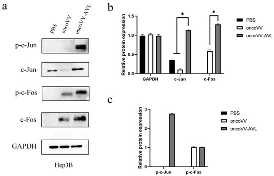 oncoVV-AVL significantly enhanced the production of c-Jun, c-Fos and their phosphorylation in SK-HEP-1 cells. GAPDH was used as the loading control, and PBS was used as the negative control. (a) The production of c-Fos and c-Jun proteins in SK-HEP-1 cells. (b) Quantification of total c-Fos and c-Jun proteins. (c) Quantification of phosphorylated c-Fos and c-Jun proteins. Data were showed in mean ± SEM, and experiments were performed in triplicate. (* p < 0.05).