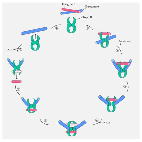 Specifically, topo II acts on both strands of DNA, being capable of removing knots or tangles from the entire DNA duplex. In fact, the cut that is occasioned in a specific region of DNA (Gate-segment) allows another DNA duplex (Transport-segment) to be crossed throughout this break, unwinding the DNA. Topo II generates a covalent interaction–called cleavage complex–with the newly cut G-segment []. In particular, the catalytic cycle of topo II is composed of: (i) binding DNA segments (G- and T-); (ii) flexing of the G-segment in the presence of metals ions; (iii) formation of the cleavage complex by a nucleophilic attack occasioned by tyrosine residues present in the catalytic site of the enzyme; (iv) closing the gate to constrain the T-segment to pass through G-segment; (v) ligation of the G-segment and release of the T-segment, and (vi) releasing of the G-segment mediated by ATP hydrolysis and arrangement of the enzyme for a new catalytic cycle (Figure 1) [].