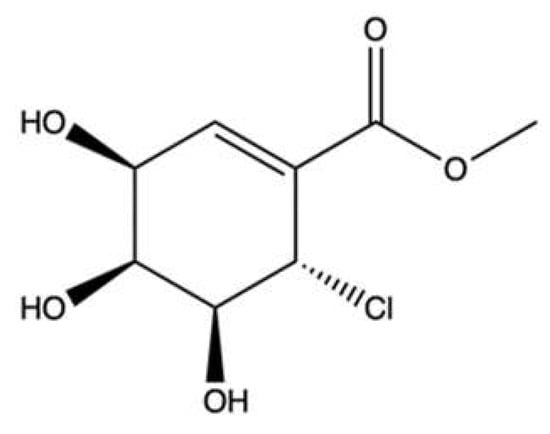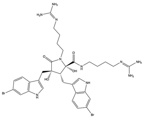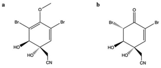 The brominated isoxazoline alkaloid aeroplysinin-1 (apl-1) (Figure 3a) and its oxidized derivative [DT; (1′R,5′S,6′S)-2-(3′,5′-dibromo-1′,6′-dihydroxy-4′-oxocyclohex-2′-enyl) acetonitrile] (Figure 3b) were isolated from the marine sponge Pseudoceratina sp. [,].