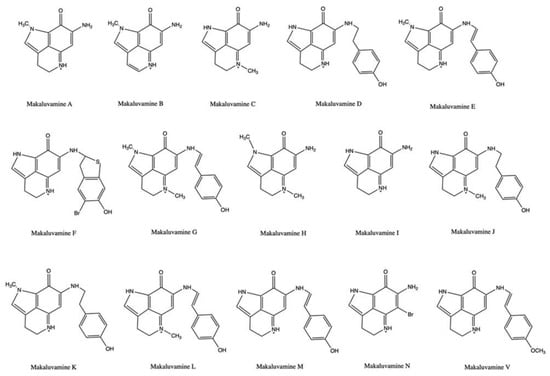 Chemical structure of makaluvamines A-V. Makaluvamine A (CAS number: 146555-78-4), makaluvamine B, C (CAS number: not available), makaluvamine D (CAS number: 146555-81-9), makaluvamine E (CAS number: 146555-82-0), makaluvamine F (CAS number: 146555-83-1), makaluvamine G (CAS number: 152273-69-3), makaluvamine H (CAS number 174232-34-9), makaluvamine I (CAS number: 138087-43-1), makaluvamine J (CAS number:174232-35-0), makaluvamine K (CAS number: 174232-36-1), makaluvamine L (CAS number: 174232-37-2), makaluvamine M (CAS number: 174232-41-8), makaluvamine N (CAS number: 187964-02-9), makaluvamine V (CAS number: 227103-87-9).