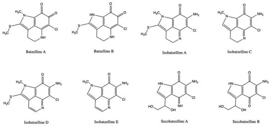 Batzellines are a group of alkaloids isolated from the marine sponge Batzella sp. (Figure 5), structurally linked to other marine substances such as makaluvamines and discorhabdins.