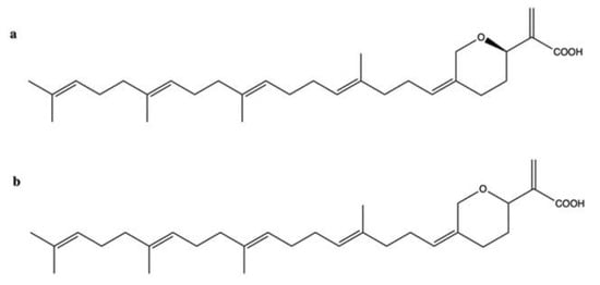 Chemical structure of halenaquinone ((a), CAS number: 86690-14-4) and xestoquinone ((b), CAS number: 97743-96-9).