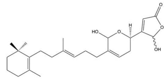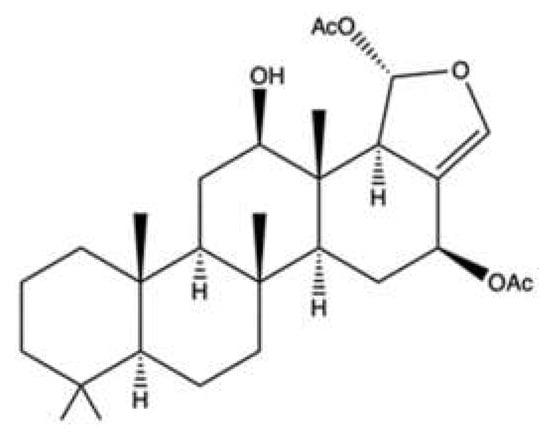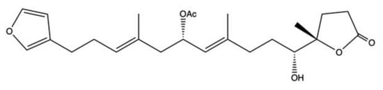 10-Acetylirciformonin B (10AB) (Figure 7) is a furanoterpenoid derivative isolated with other terpenoid-derived metabolites from the marine sponge Ircinia sp. [].