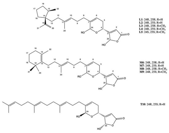 More recently, 10 manoalide-like sesterterpenoids (Figure 9) were isolated from Luffariella sp. sponge: 24R,25R-luffariellin A (L1), 24R,25S-luffariellin A (L2), 24R-O-Methyl-25R-luffariellin A (L3), 24R-O-Methyl-25S-luffariellin A (L4), 24S-O-Methyl-25S-luffariellin A (L5), 24R,25R-manoalide (M6), 24R,25S-manoalide (M7), 24R-O-Methyl-25R-manoalide (M8), 24R-O-Methyl-25S-manoalide (M9), and 24R,25S-thorectolide (T10) [].