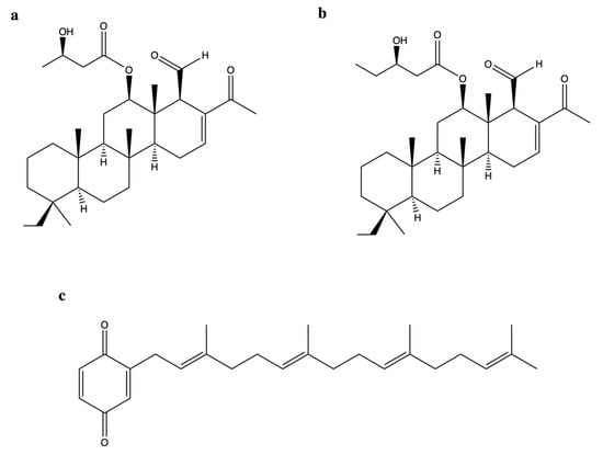 Chemical structure of 12β-(3′β-hydroxybutanoyloxy)-20,24-dimethyl-24-oxo-scalara-16-en-25-al (a), 12β-(3′β-hydroxypentanoyloxy)-20,24-dimethyl-24-oxo-scalara-16-en-25-al (b), and 2-tetraprenil-1,4-benzoquinone ((c) CAS numbers not available).