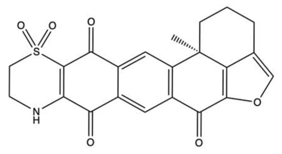 Alongside halenaquinone and xestoquinone, other polycyclic quinone-type metabolites were isolated from the sponge Xestospongia sp. []. All studied compounds inhibited topo II (Table 1). Among those, adociaquinone B (Figure 13) was the most potent with an IC90 (the concentration inducing the 90% of inhibition) < 11 μM and 78 μM for DNA decatenation and relaxation, respectively. In contrast to xestoquinone and halenaquinone, adociaquinone B was a non-intercalating DNA topo II poison. In fact, it strongly promoted the formation of the enzyme-DNA cleavable complex to the same extent as mitoxantrone, a known topo II poison []. However, in contrast to mitoxantrone, adociaquinone B did not intercalate into DNA since it was not able to displace ethidium bromide from calf thymus DNA []. Secoadociaquinone A and B, two other Xestospongia sp. metabolites, inhibited topo II activity in the cell-free DNA decatenation assay without exhibiting cytotoxicity since they were unable to permeate cell membranes. Thus, it is not sufficient to test the inhibitory activity of topo II only on cell-free systems, as very often the physicochemical properties of the tested compounds prevent their entry into cells and consequently a possible interaction with intracellular targets, such as topo II [].