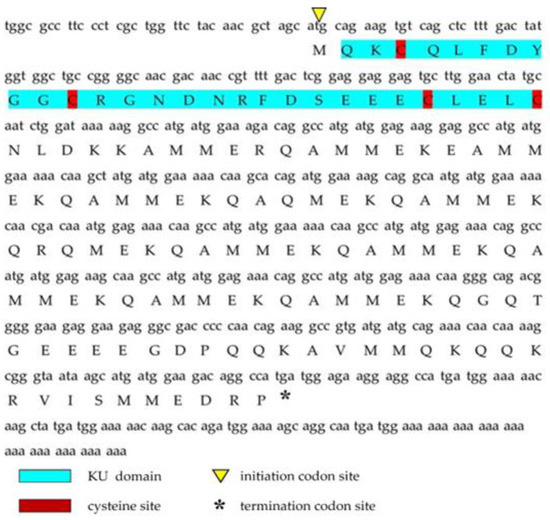 The full-length cDNA sequence of Ct-kunitzin and its deduced amino acid sequence. The KU domain is blue; the initiation codon site is the yellow upward-facing triangle; the termination codon site is the downward-facing triangle; the cysteine site is red.
