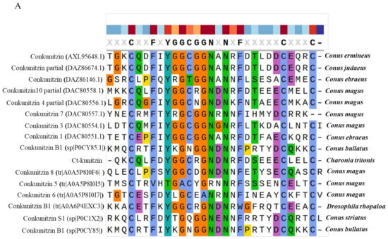 In conclusion, the putative toxins identified in this study indicated the molecular diversity of C. tritonis venoms and reflected conservation of core toxin families. These new results can also be used for novel protein/peptide discovery or further comparative studies to increase our understanding of the toxicology of marine venoms. From a pharmacological perspective, there has been a gradual realization that these disulfide-rich peptides might provide a greater opportunity for the development of active marine venom-derived drugs.
