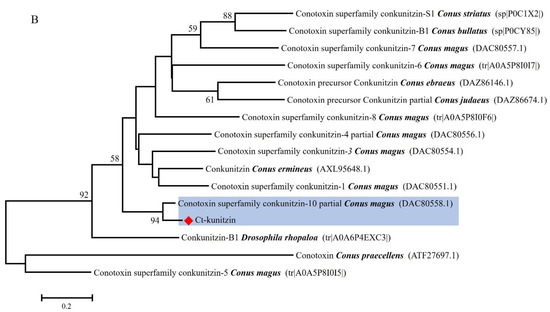 Phylogenetic analysis of venom proteins containing Kunitz domains. (A). Multiple alignment of Ct-kunitzin with 15 different Kunitz peptides based on the conserved sequences. The alignment was generated with the ClustalX Multiple Sequence Alignment program (version 1.83). (B). The Neighbor-joining (NJ) tree was constructed based on amino acid sequences using MEGA software version 6.06. The numbers below the nodes show bootstrap support values from 1000 replicates.