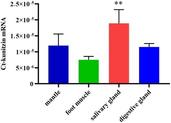 The tissue distribution of Ct-kunitzin was deduced from a qPCR experiment. This showed that Ct-kunitzin is highly expressed in the salivary gland of C. tritonis (p < 0.01) (Figure 3), which indicates that the salivary gland plays a toxin-secreting role in C. tritonis.