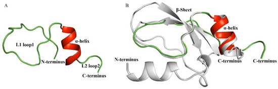 Overview of the three-dimensional structure of Ct-kunitzin and homologous structural modeling of Ct-kunitzin and a template protein named conkunitzin-10 (DAC80558.1). (A) 3D models of Ct-kunitzin. The main secondary structure elements are colored, with the α helix in red and loops colored in green. (B) Homologous modeling based on a highly homologous protein. The structures are shown in cartoon form; light grey for Ct-kunitzin, red and green for conkunitzin-10 (DAC80558.1).